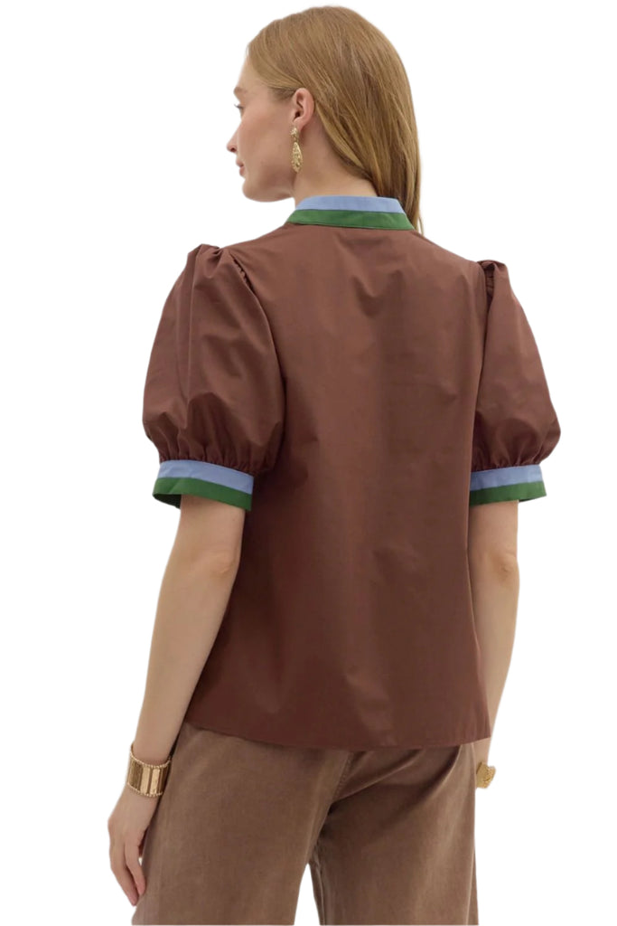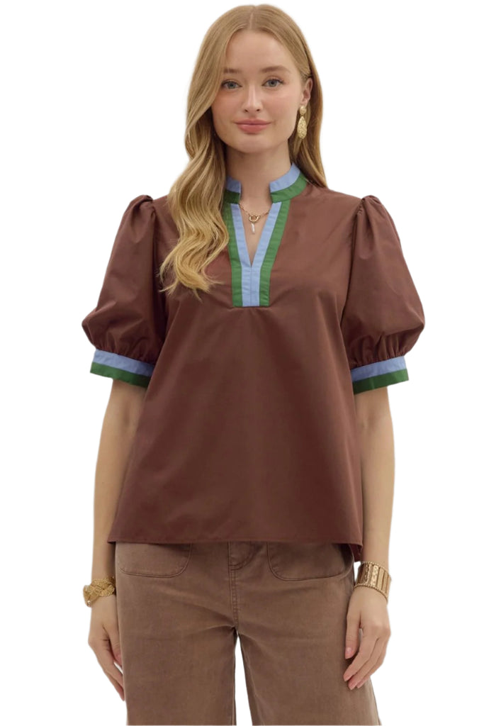 Solid short bubble sleeve featuring multicolor band finish. Unlined. Woven. Semi-sheer. Lightweight.