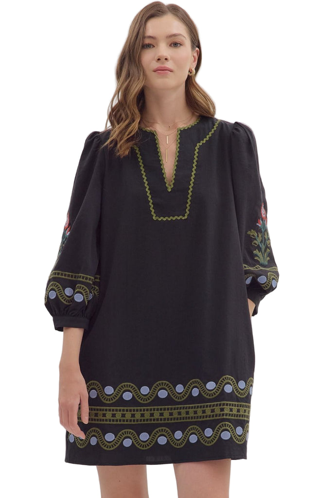 Solid 3/4 puff sleeve mini dress featuring embroidered floral and geometric sleeve and hem detail with scallop accent trim at neckline. Side pockets. Lined. Woven. Non-sheer. Lightweight.