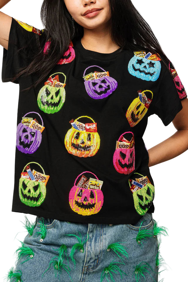 Celebrate spooky season in style with the Black Multi Candy In Halloween Baskets Tee. This playful shirt features a colorful Halloween basket filled with a variety of candies, making it the perfect festive outfit for trick-or-treating or Halloween parties. Comfortable and fun, it adds a sweet touch to your autumn wardrobe.