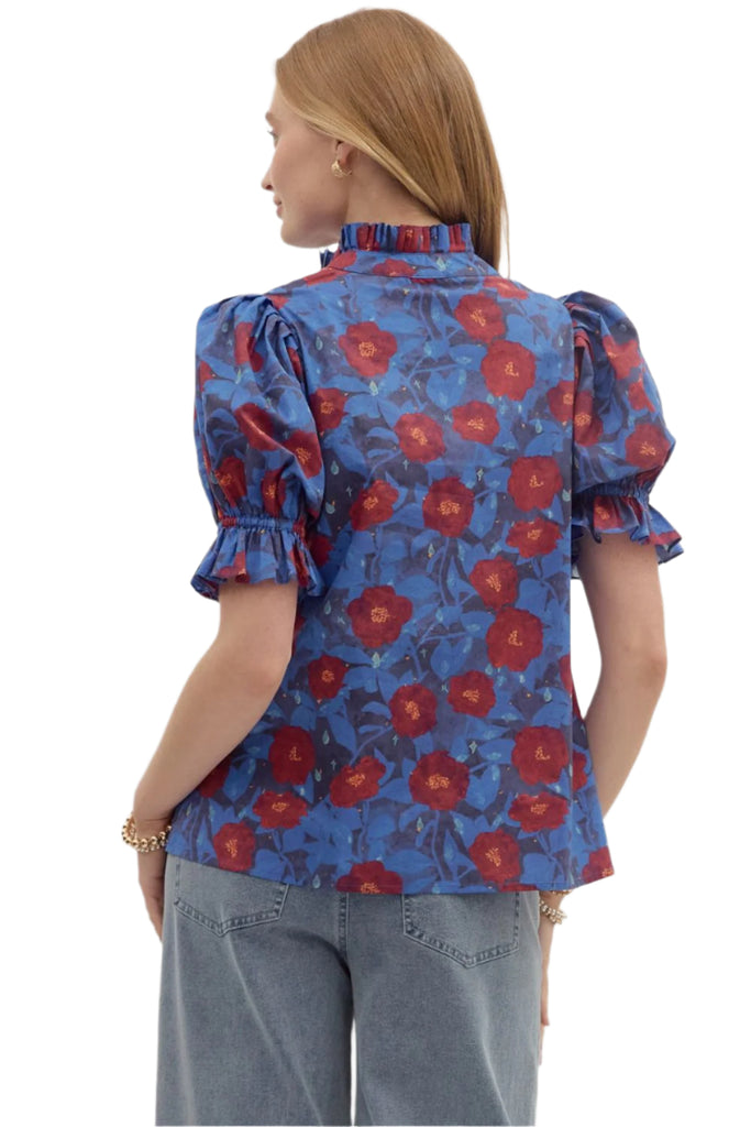 Floral pattern short puff sleeve pullover top featuring pleated ruffle V-neck band collar. Unlined. Woven. Non-sheer. Lightweight.