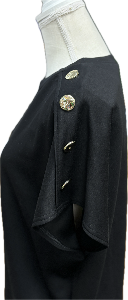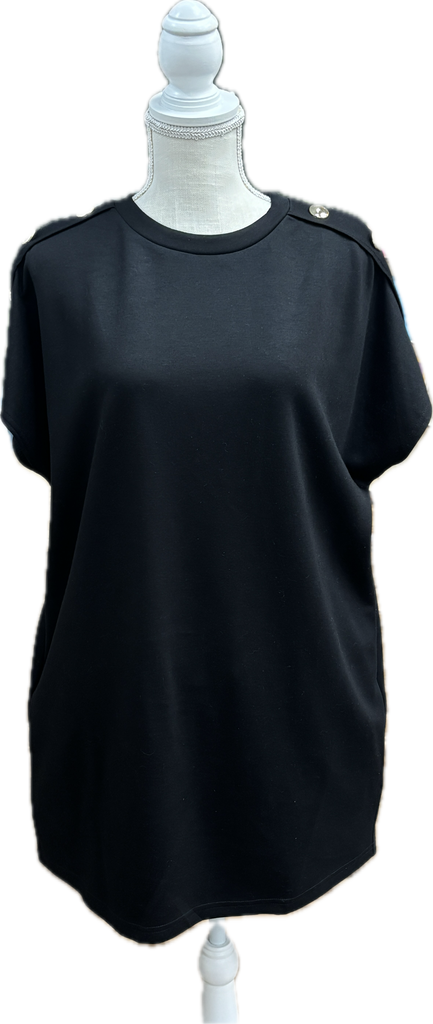Solid short sleeve mini dress featuring decorative gold button detail along shoulder seams. Side pockets. Unlined. Knit. Non-sheer. Lightweight.